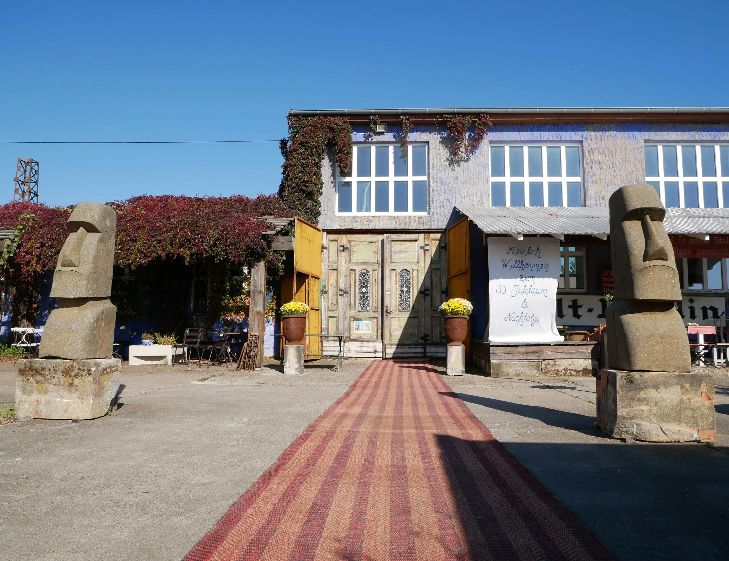 Die BLAUE HALLE, ist eine besondere Eventlocation inmitten der Natur auf dem verwunschenen Gelände von “Historische Bauelemente”